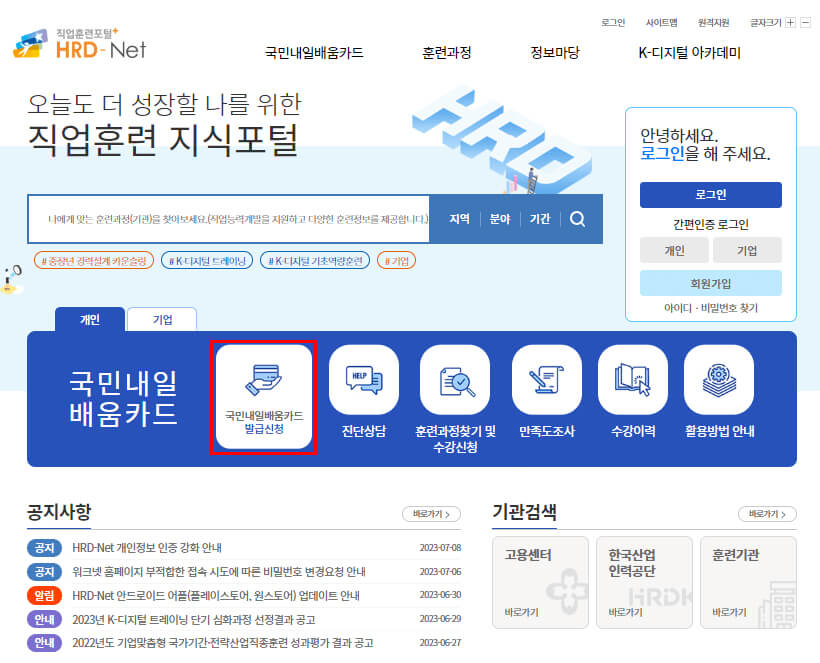 HRD-Net 홈페이지 로그인 후 메인화면에서 국민내일배움카드 '발급 신청'으로 이동합니다.