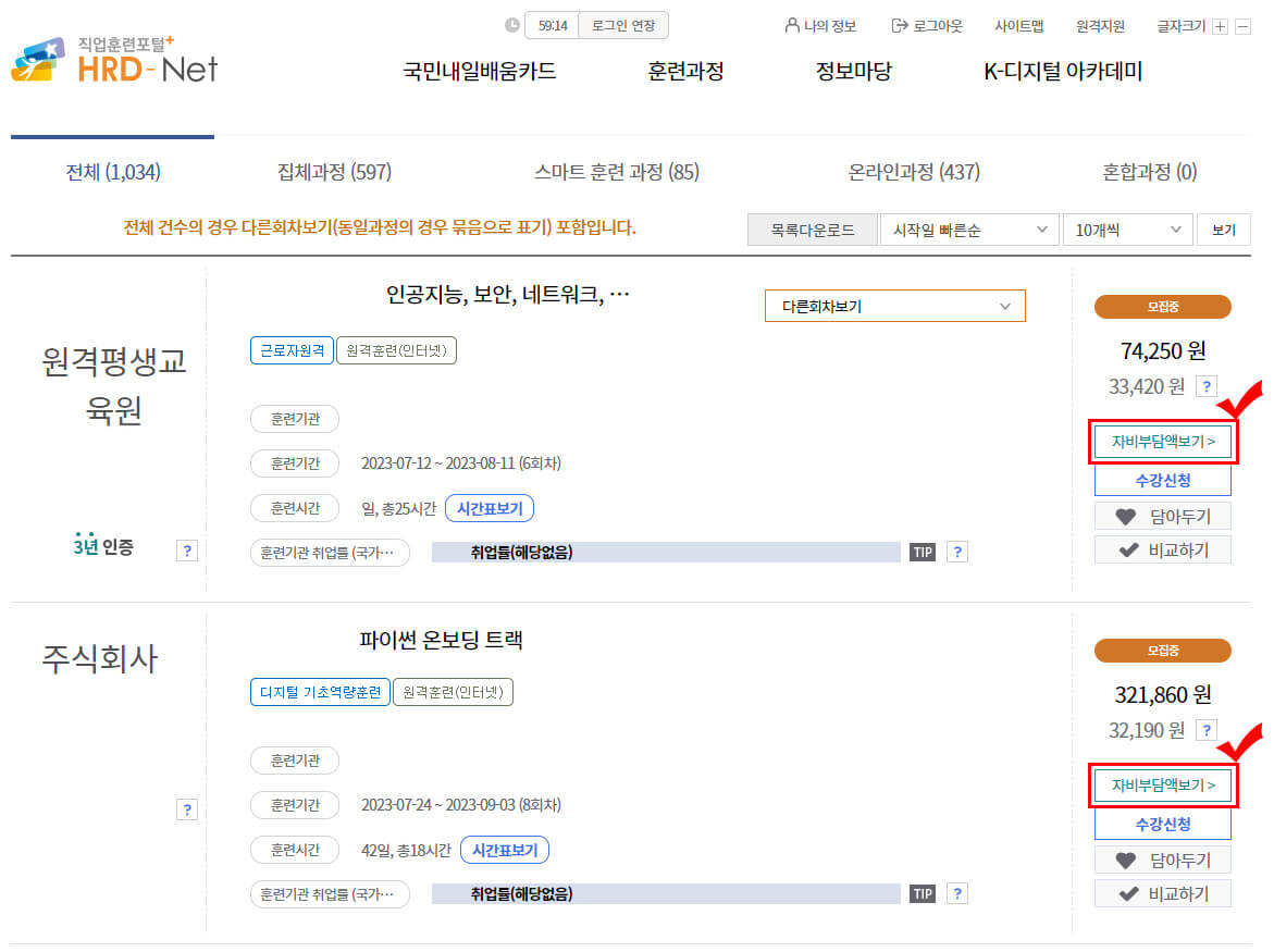 내일배움카드로 총 훈련비를 결제하면, 국가에서 지원받은 300만원에서 국가지원훈련비만큼의 돈이 차감이 되고 나머지 금액은 자비부담금으로 내일배움카드 발급시 작성한 계좌에서 빠져나갑니다. HRD-net을 통해 교육과정을 검색 후 오른쪽 "자비부담액보기"를 눌러 금액을 확인해보실 수 있습니다.