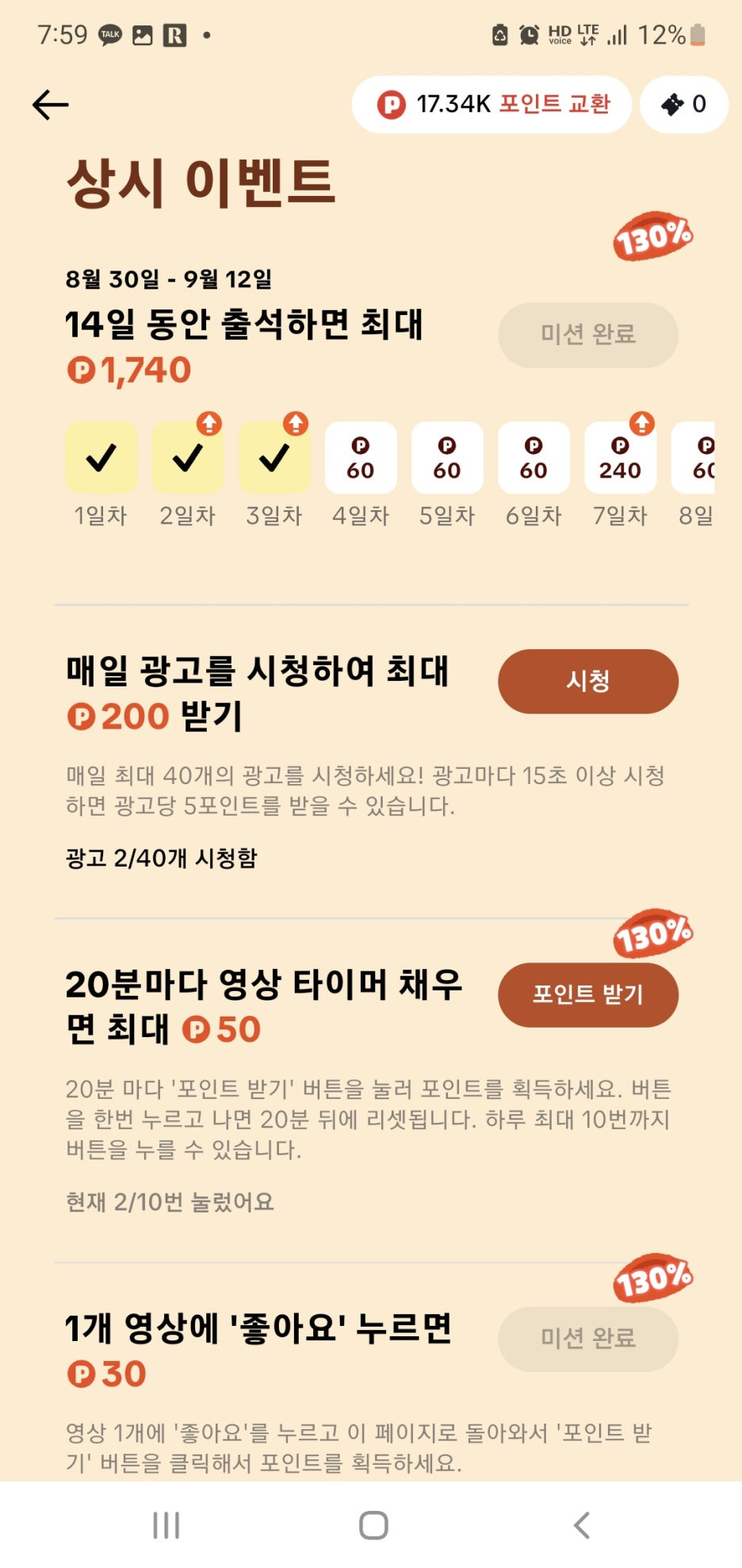 매일 광고를 시청하거나 0분마다 영상 타이머 채우기, 1개 영상의 좋아요 누르기 등 달성하기 쉬운 미션들로 구성되어 있습니다. 포인트 자체는 작지만 티끌모아 태산은 안되더라도 소소하게 틱톡 포인트를 받을 수 있는 재미가 있습니다.