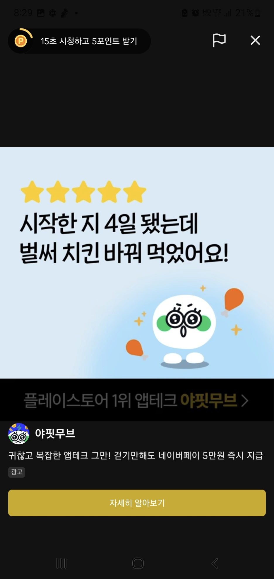화면 좌측 상단에 P로 되어 있는 동전모양의 시청 시간을 채우면 포인트가 적립되는 형태입니다.