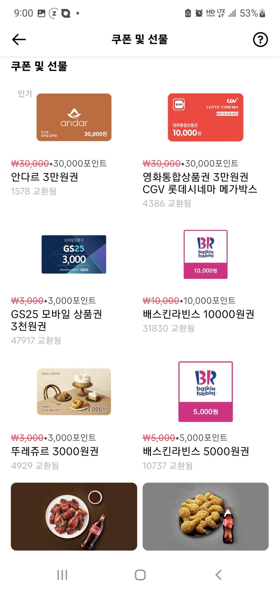 포인트는 1:1 비율로 책정이 되어 스타벅스 e카드 교환권, GS25/CU 모바일 상품권, 배스킨라빈스 모바일 상품권으로 교환이 가능합니다.